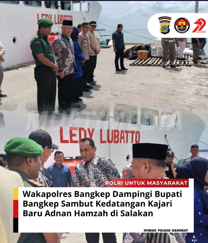 MATASMS, COM. , Banggai Kepulauan – Kepolisian Resor (Polres) Banggai Kepulauan menunjukkan sinergi kuat dengan unsur Forum Komunikasi Pimpinan Daerah (Forkopimda) dalam menyambut Kepala Kejaksaan Negeri (Kajari) Banggai Laut yang baru. Pada Minggu (27/7/2025) pukul 11.15 WITA, Wakapolres Banggai Kepulauan Kompol Abidin, S.H., mewakili Kapolres Bangkep, turut serta mendampingi Penjabat Bupati Banggai Kepulauan, Rusli Moidadi, S.T., M.T., dalam penjemputan resmi Kepala Kejaksaan Negeri (Kajari) Banggai Laut yang baru, Adnan Hamzah, S.H., M.H., beserta istri, Ibu Wana, di Pelabuhan Salakan.