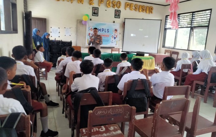 Bhabinkamtibmas Desa Lape Aipda M. Yusuf bersama Kanit Binmas Polsek Poso Pesisir Ipda Ramlin menggelar penyuluhan kepada siswa-siswi baru SMPN 2 Poso Pesisir.