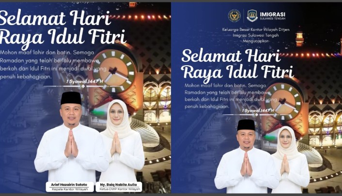 MataSMScom. Palu. Dalam semangat Idulfitri 1447 H, kami segenap keluarga besar Kantor Wilayah Ditjen Imigrasi Sulawesi Tengah mengucapkan Selamat Hari Raya Idulfitri, Taqabbalallahu منا ومنكم, shiyamana wa shiyamakum. Semoga amal ibadah kita selama bulan suci diterima oleh Allah SWT, serta menjadikan kita pribadi yang lebih baik, lebih sabar, dan lebih peduli terhadap sesama.