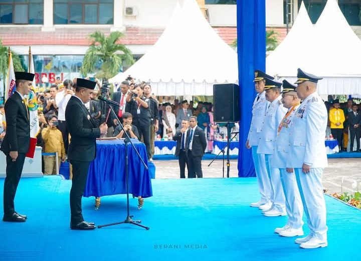 Prosesi diawali pembacaan Keputusan Menteri Dalam Negeri Republik Indonesia dan dilanjutkan pengambilan sumpah jabatan oleh Gubernur, yang dalam pernyataannya menekankan bahwa pelantikan ini bukan hanya momen administratif, tetapi titik awal tanggung jawab besar dalam menjawab amanah rakyat.