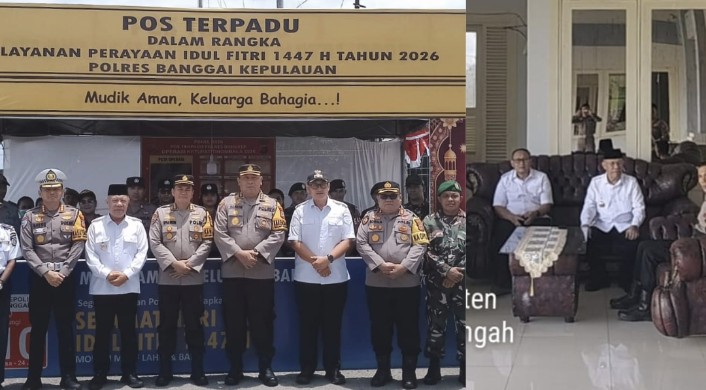 Petinggi Polda Sulteng bersama Bupati Bangkep, wakil Bupati dan Kapolres Bangkep AKBP Ronaldus Karurukan. SIK meninjau Pos Pengamanan Terpadu dalam rangka pelayanan perayaan Idul Fitri 1447 h tahun 2026.