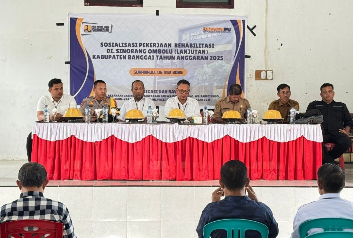 MATSMS, COM. BANGGAI. Polsek Batui jajaran Polres Banggai hadiri kegiatan Sosialisasi pelaksanaan pekerjaan rehabilitasi jaringan irigasi di Desa Sukamaju 1, Kecamatan Batui Selatan, Selasa (6/5/2025).