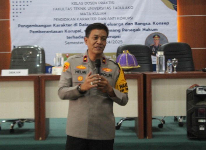 MATASMS, Com. Palu – Wakil Kepolisian Daerah (Wakapolda) Sulawesi Tengah (Sulteng) Kombes Pol. Dr. Helmi Kwarta Kusuma Putra Rauf, S.I.K., M.H., berkesempatan menjadi Dosen Praktisi mata kuliah Pendidikan Karakter dan Anti Korupsi, Rabu 07/05/2025 pagi, di auditorium Fakultas Teknik, Universitas Tadulako (Untad) Palu.